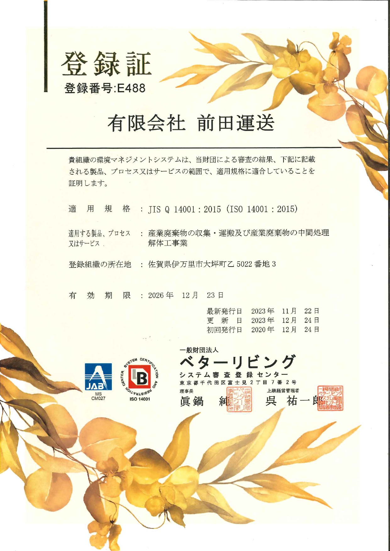 根拠:ISO14001に基づく環境マネジメントが構築されているため、解体後の産業廃棄物が法令に則り適正に分別・収集・処分されます。